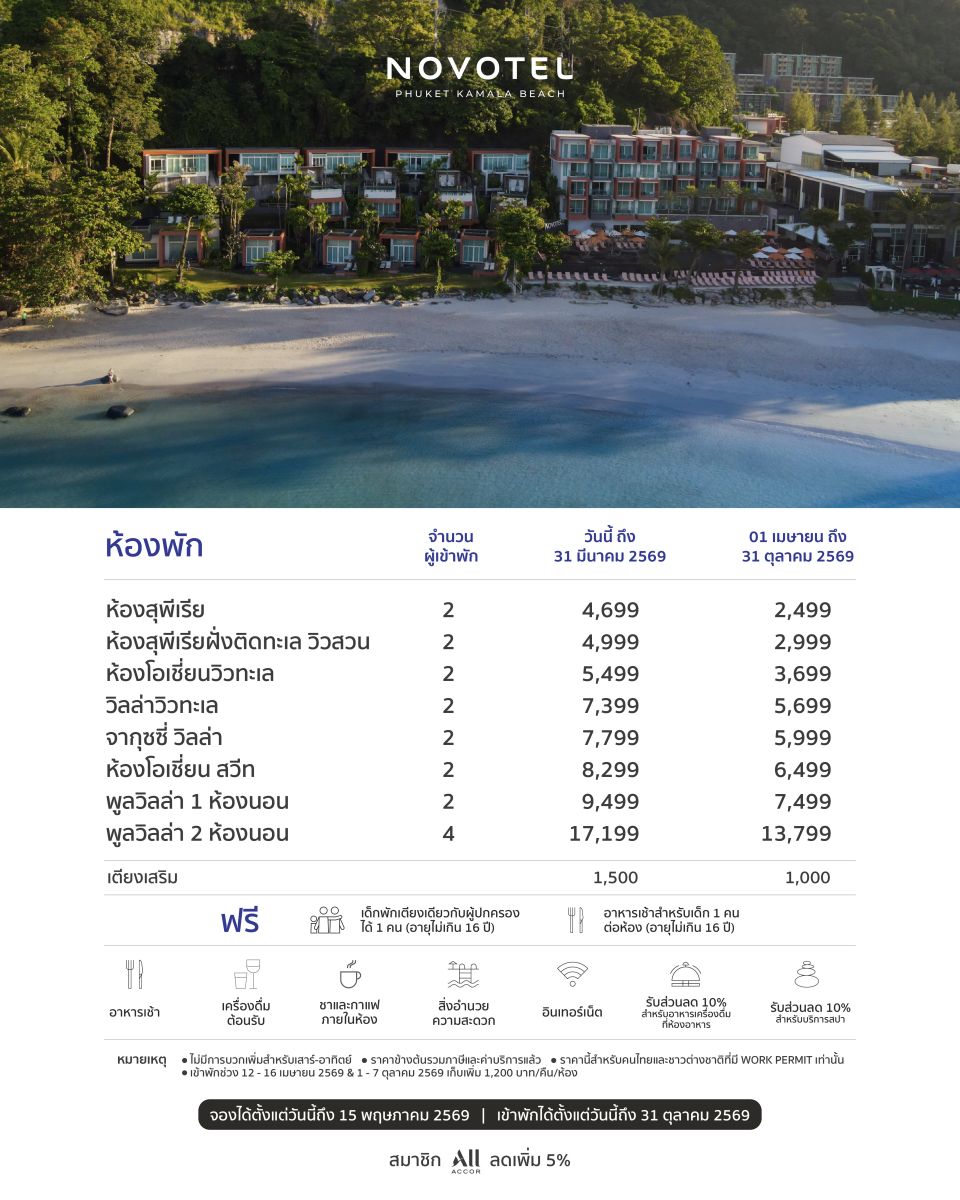 ● การเข้าพักช่วง 12 – 16 เมษายน 2569 และ 1 – 7 ตุลาคม 2569 มีค่าบริการเพิ่มเติม 1,200 บาท ต่อห้อง ต่อคืน